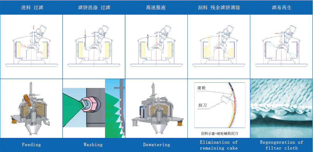The automatic bottom discharge scraper centrifuge is vertical fully-automatic filtration centrifuge. The motor drives the basket to rotate at high speed through the belt, and under the control of pre-written program, the material to be separated is fed into the basket through the feed system. After the material is filtered through the filtration medium (filter cloth/screen) under the action of centrifugal force, the liquid phase discharges out of the centrifuge through the liquid pipeline, and the solid phase is retained in the basket. A material detection device is used to detected material filling position in real-time manner, and when the solid cake deposited in the basket reaches the specified holding capacity of the centrifuge, feeding stops. Then wash and dry the solid cake. After the solid cake meets requirements for knock-out, the centrifuge reduces to the scraping rate, under the hydraulic (pneumatic) control, the scraper device removes the solid cake, and then the cake id discharged at bottom outlet of the centrifuge.